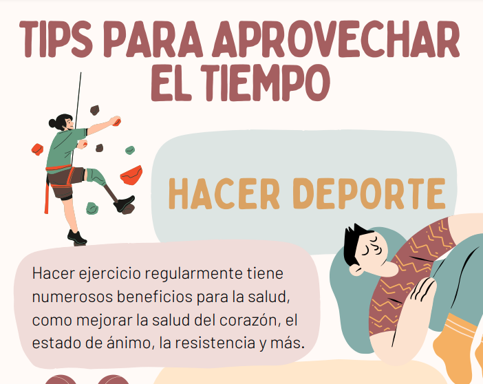 En esta experiencia, medinate la creación de una infografía se abordó un tema fundamental para los adolescentes: el uso adecuado del tiempo libre. Se resaltó la importancia de encontrar un balance entre el estudio y las actividades que nos gustan, desde hacer deporte hasta simplemente relajarnos. También se dieron algunos tips para organizar mejor el tiempo, evitar el estrés y sacarle el máximo provecho a cada día. En pocas palabras, la idea fue entender que el tiempo libre no es solo para descansar, sino también para crecer y disfrutar.