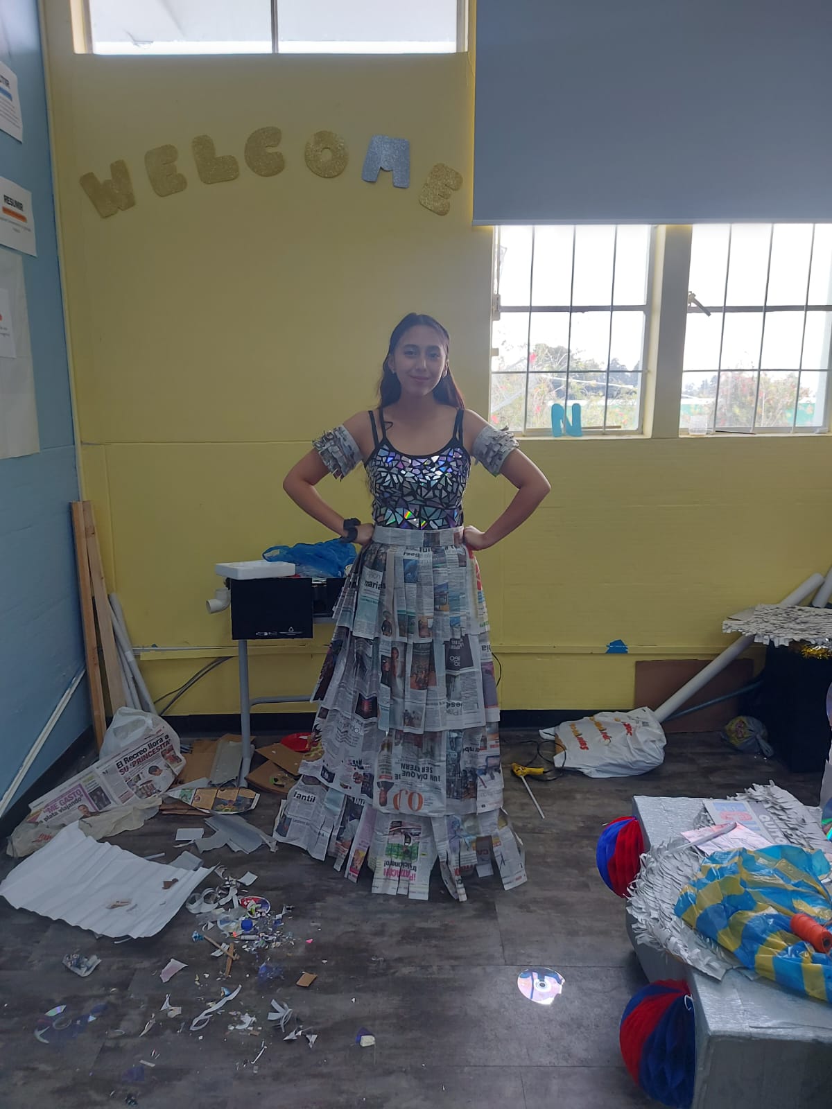En lugar de utilizar trajes convencionales, decidimos confeccionarlos con materiales reciclados como cartón, papel, plástico y tela en desuso. Nuestro objetivo no era solo rendir homenaje a la identidad quiteña, sino también generar conciencia sobre la importancia del reciclaje y la sostenibilidad dentro de nuestra comunidad escolar.